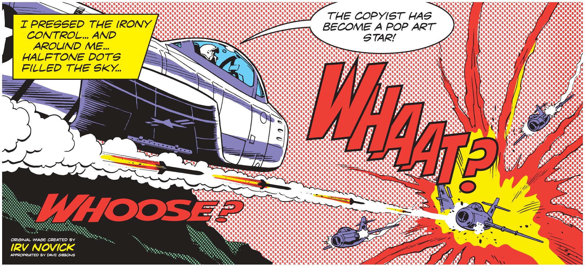 This exercise fails, unfortunately, to give us the direct comparison we might crave. Only paint on canvas, the same size as Whaam! and hung on the same wall, could really answer the question: Irv or Roy? The sheer scale of a Lichtenstein, including the actual size of its dots, really does add something in itself to the impact of the image. Only a gallery wall can give our eyes that experience. Prints, posters and books are never even a good second best. But it’s a spirited attempt by the British lad, and the Legion are very happy to have an A2 print of Whaat? for our own clubhouse wall. Available from http://print-process.com/product/?product-id=1096. Did we say that before?