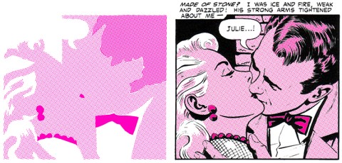 Other pre-pop or proto-pop artists (Schwitters, Paolozzi) had used comic strip and Disney characters in collages long before, and of course Richard Hamilton’s collage Just what is it that makes today’s homes so different, so appealing? – sometimes said to be the picture that launched Pop Art in 1956 – incorporates a romance comic cover (actually from a house ad within another comic) in its mix of advertising imagery.