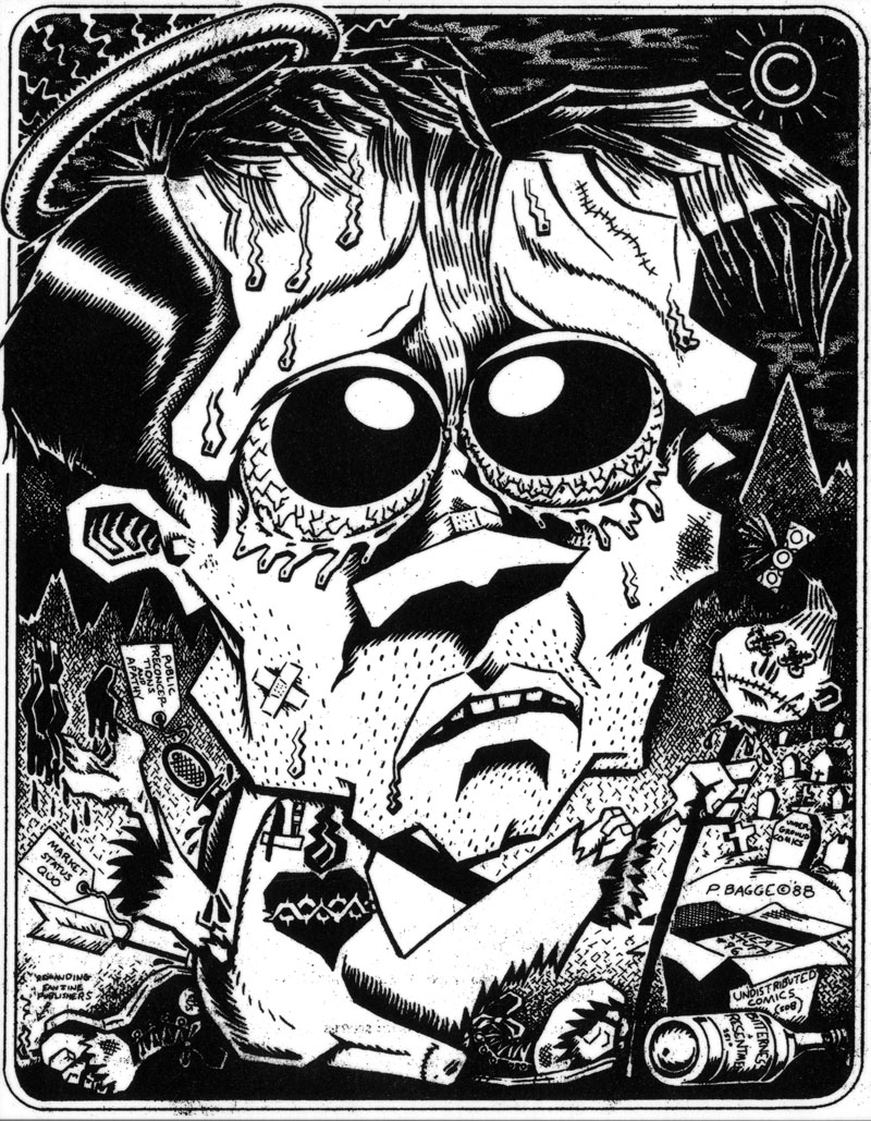 Bagge portrays himself as one of those Margaret Keane-type Big-Eyed Kids which are hideous enough in themselves — the more so as this one has scars, a Catholic bleeding heart on his shirt, and a tarnished halo. He is the artist as martyr to the various forces working to finish him off — stabbed by the knife of Public Preconceptions and Apathy, drinking from the bottle of Bitterness and Resentment. He is even being given a hot-foot by Demanding Fanzine Publishers. (Oops. Mea Culpa.)
