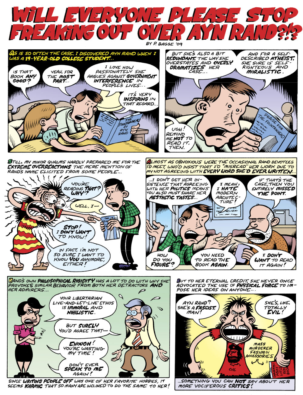 In recent years Bagge has done strips for a libertarian magazine, Reason, and has said that his own politics can be considered libertarian (with caveats, for example, about the kind of libertarians who run for office, or have the name Ayn Rand). Here is Kent Worcester from the previously unpublished 2014 interview which closes the book: