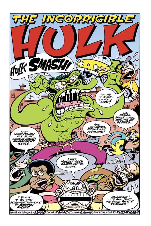 Having said that, Conversations is not in any sense a “difficult” read. The interviews are often almost as entertaining as Bagge’s comics. They are taken from diverse general — i.e non-academic — sources. There is no thesis-speak or surfeit of polysyallables. Indeed these texts present such a complete “picture” of Peter Bagge that I barely missed the illustrational side of his work while reading. Afterwards I did Google up some pictures, mainly to look at some of what I’d missed over the last ten or so years. Using the wonders of modern blognology I can of course give you more pictures than University Press of Mississippi can — and I will, at the end of my review.