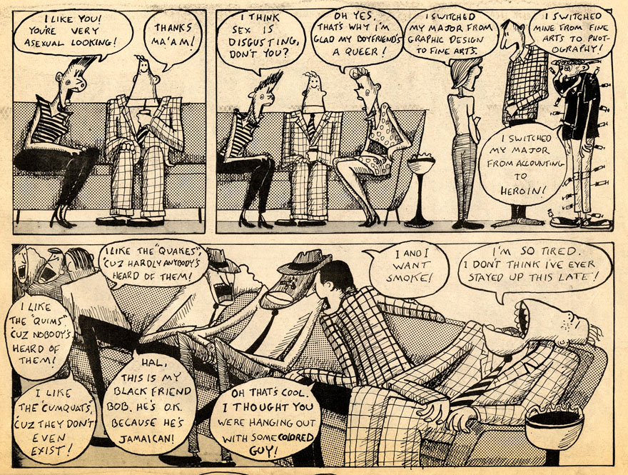 Well, that is the Second Thing that leaps out from the pages of Conversations: Bagge’s progress as political and social commentator. In his earlier days Bagge was keen to distance himself from any political implications of this work, though by 1992 he was almost ready to concede that there might just be some: