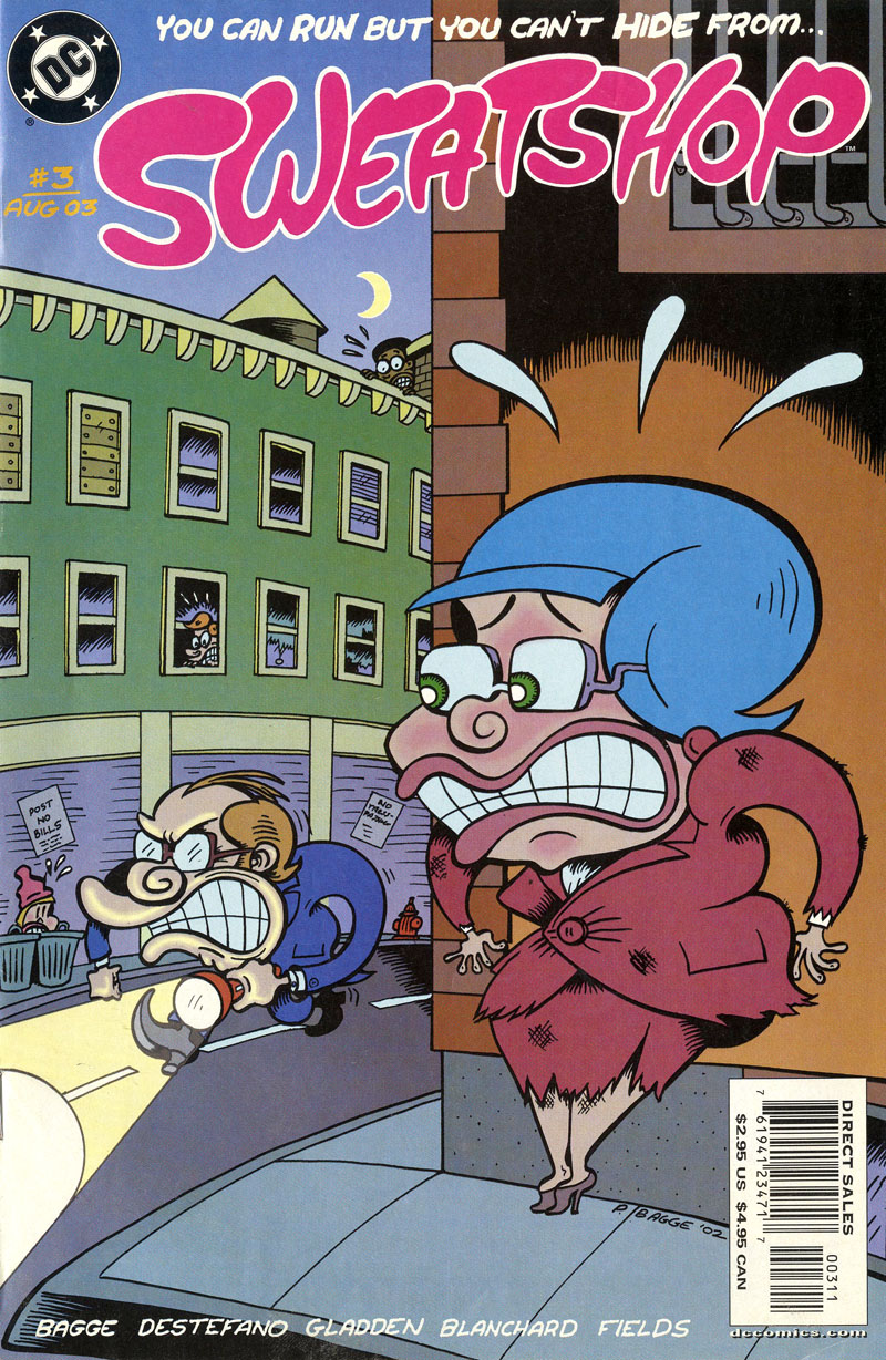 Bagge takes his humour mainstream, and indeed to kid level, with mixed results. Sweatshop, 2003, may have toned down the confront-o-meter, but it was a very funny take on the world of newspaper cartooning (and the youngsters who slave for the crotchety “Man”). Yeah! (1999) has had a book collection, though I bought the comics out of a bargain bin in 2014.
