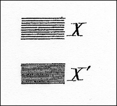 In diagrams provided with the 1881 patent, Day shows how this could work in practice, with two simple examples. First a line pattern X is repeated at an even spacing to produce a doubly-dark line shading pattern, X’:
