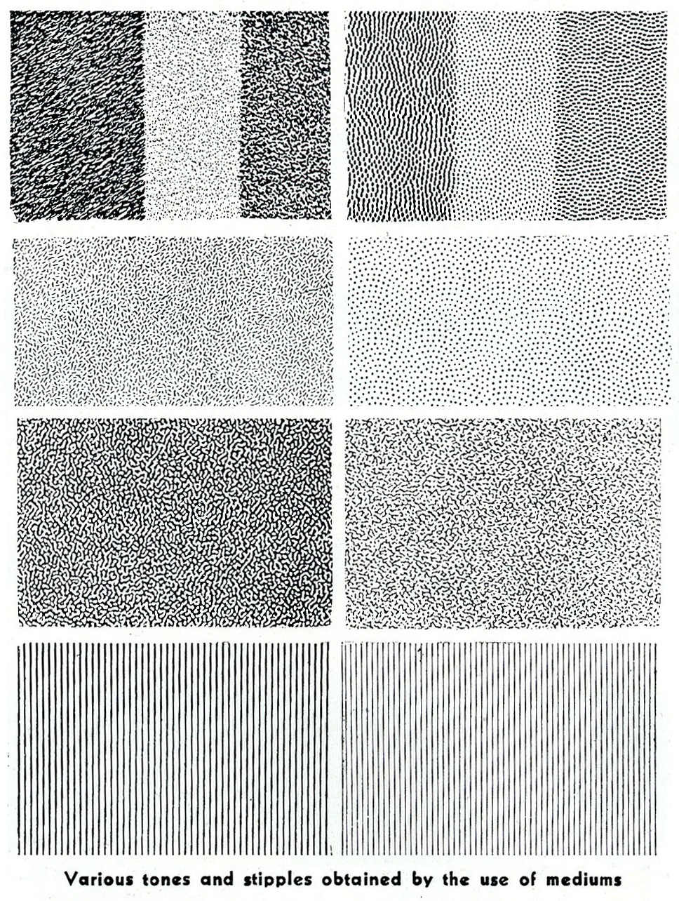 This illustration, from a 1940 book by renowned lithographer Thomas Griffits, shows some typical patterns achieved with crayon / chalk. The upper rectangles are about 40 x 35 mm on the page. (7)