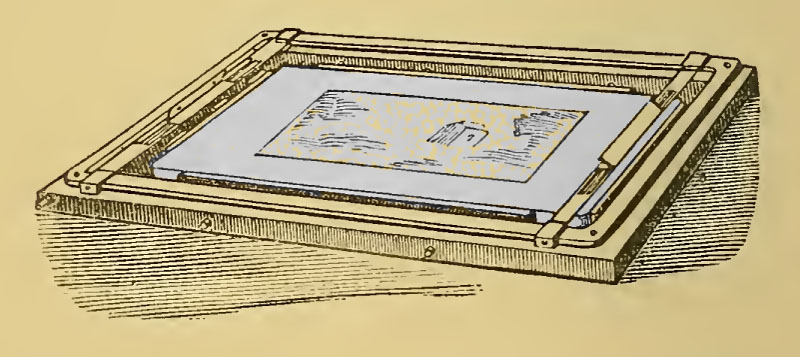 Registering machines have also been employed by some lithographers with success, and though they are not usually on sale by dealers… they may be had to order. [The illustration] shows one of these contrivances adapted to a stone. It consists… of a frame adapted to the stone by means of set screws, which answer the double purpose of securing the frame to the stone and adjusting it in position.