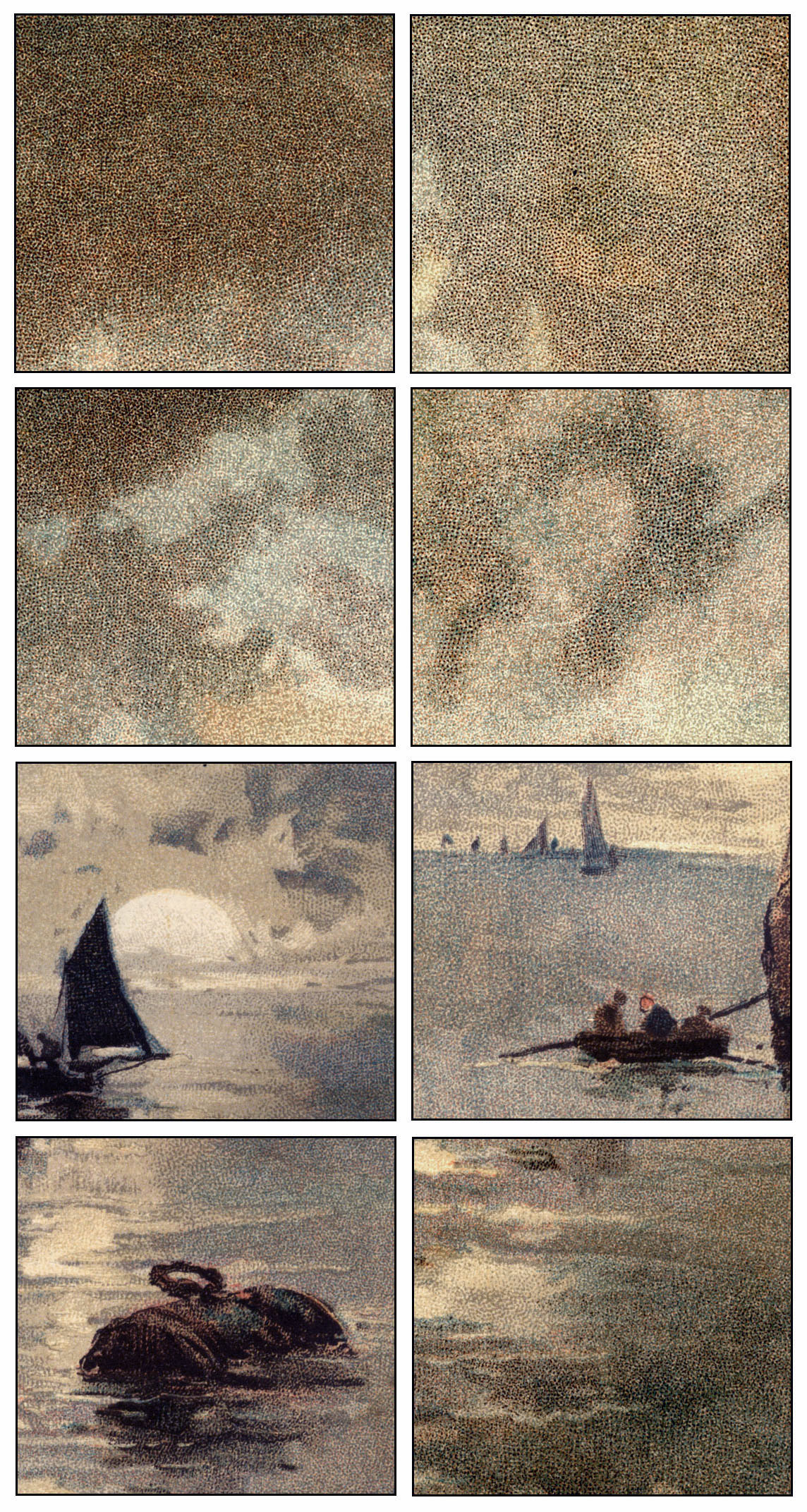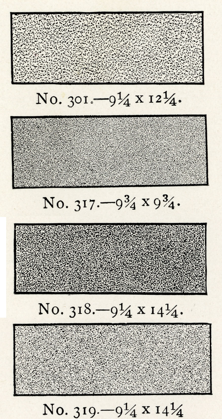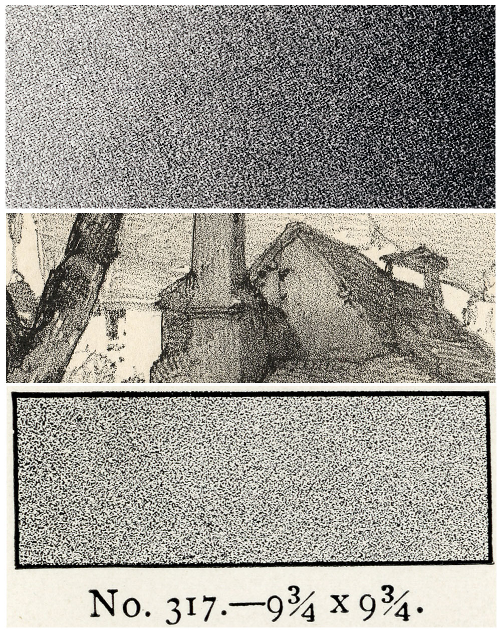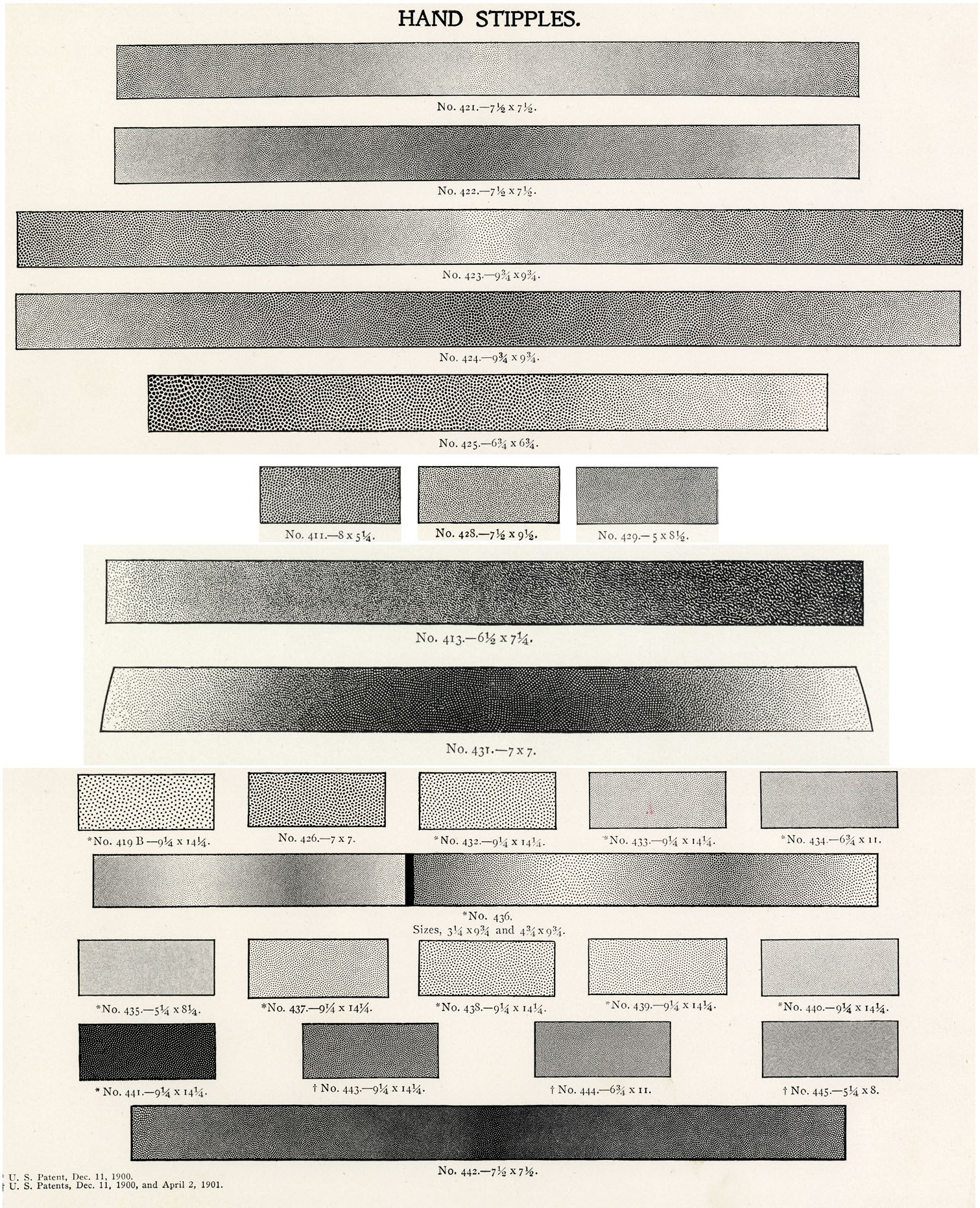 Below is the selection of patterns he showed in his article, presumably reflecting the patterns which he himself—and perhaps lithographers in general—found most useful. The top two are shown overlaid with themselves in different ways. Most are “hand-stipple” or grained patterns. Even at this late date, Page chooses no regular grids of dots in the “halftone” manner, which were being widely used by the photoengraving opposition—of which, more next time.