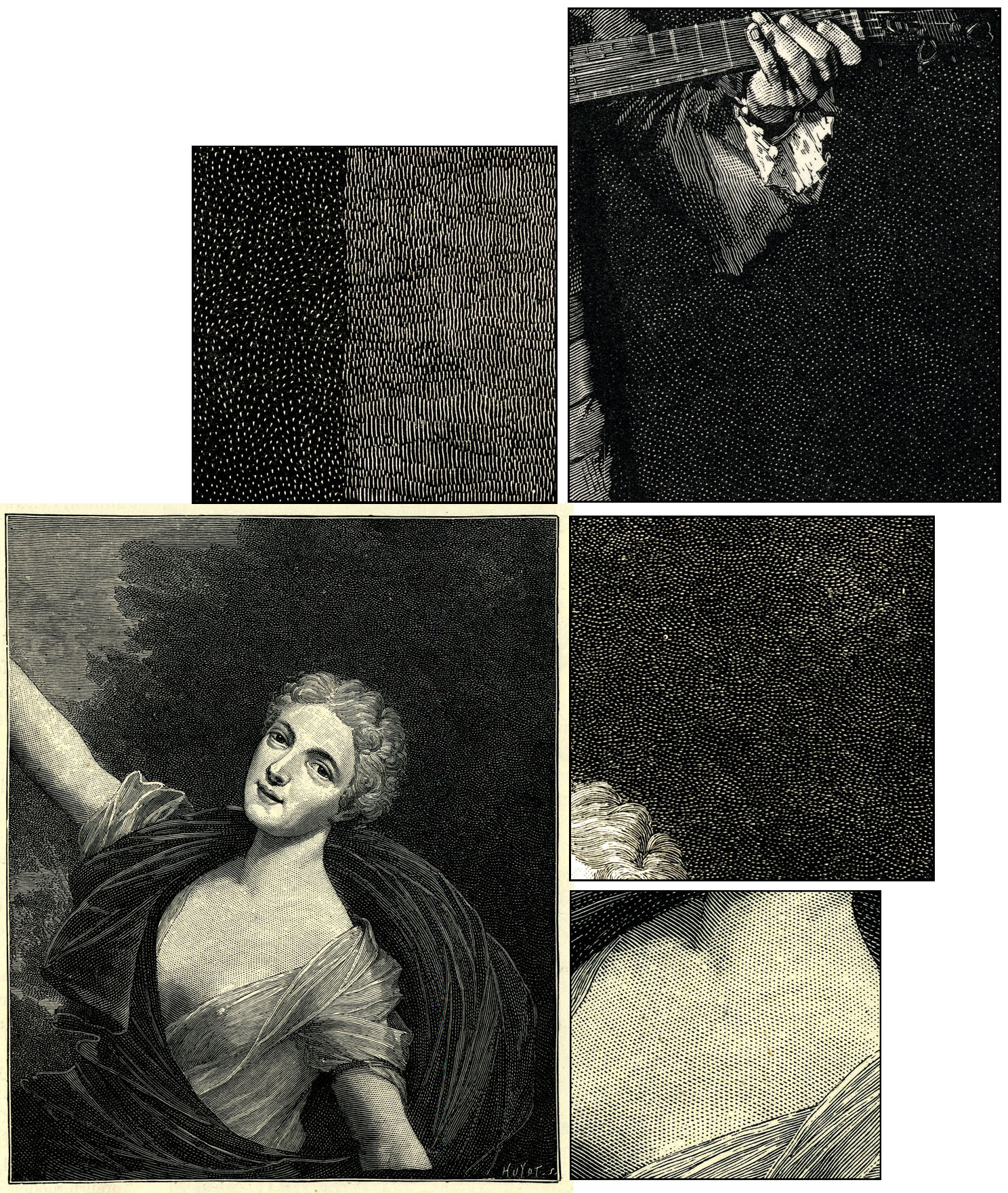 Firstly, whereas today we think of Ben Day dots as regular round dots in a mathematically precise pattern, in their early days they were intended to look like hand-drawn stippling. Day was mimicking the kind of dots that artists and printers were already using. These might be semi-regular—perhaps laid out in curved lines—but they were recognisably marks made by hand.