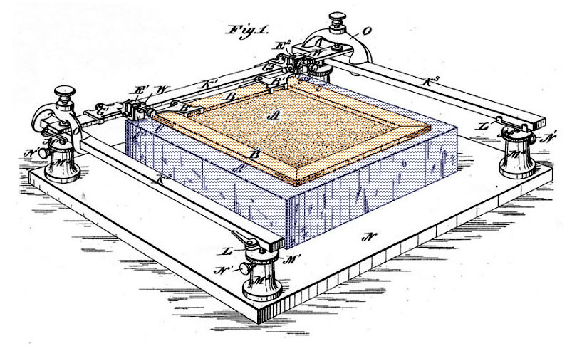 On Day’s new device, the adjustment screws moved the frame one thirty-second of an inch per complete turn. “By means of the pointer V and the scale on the dial W the most minute movements of the screws can be regulated and measured,” as Day said in his 1881 Letter Patent.