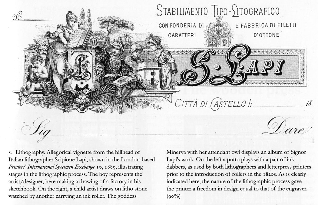 The Italian billhead below shows some of this, as well as a scene illustrating lithography itself. Click to enlarge, and you should be able to read the original caption which I have left in place.(6)