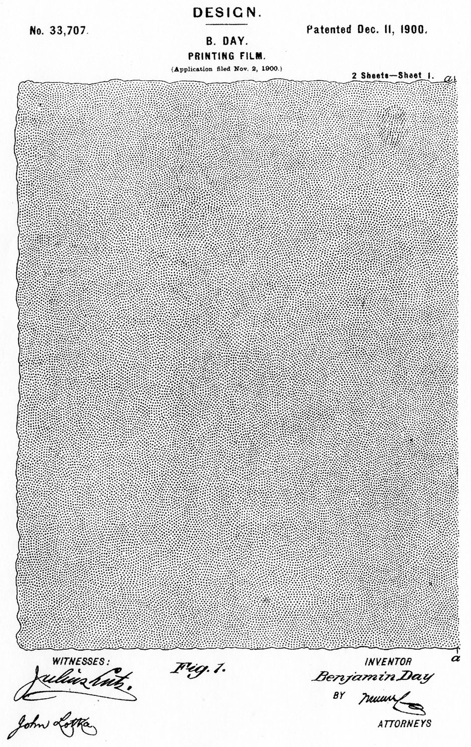 It is likely that some or all of these same patterns were in use much earlier than that. Bamber Gascoigne, in his 1986 book How To Identify Prints, reports an early Ben Day advertisement from 1887, stating that more than a hundred varieties of screen were then available, including grained tints. (10)