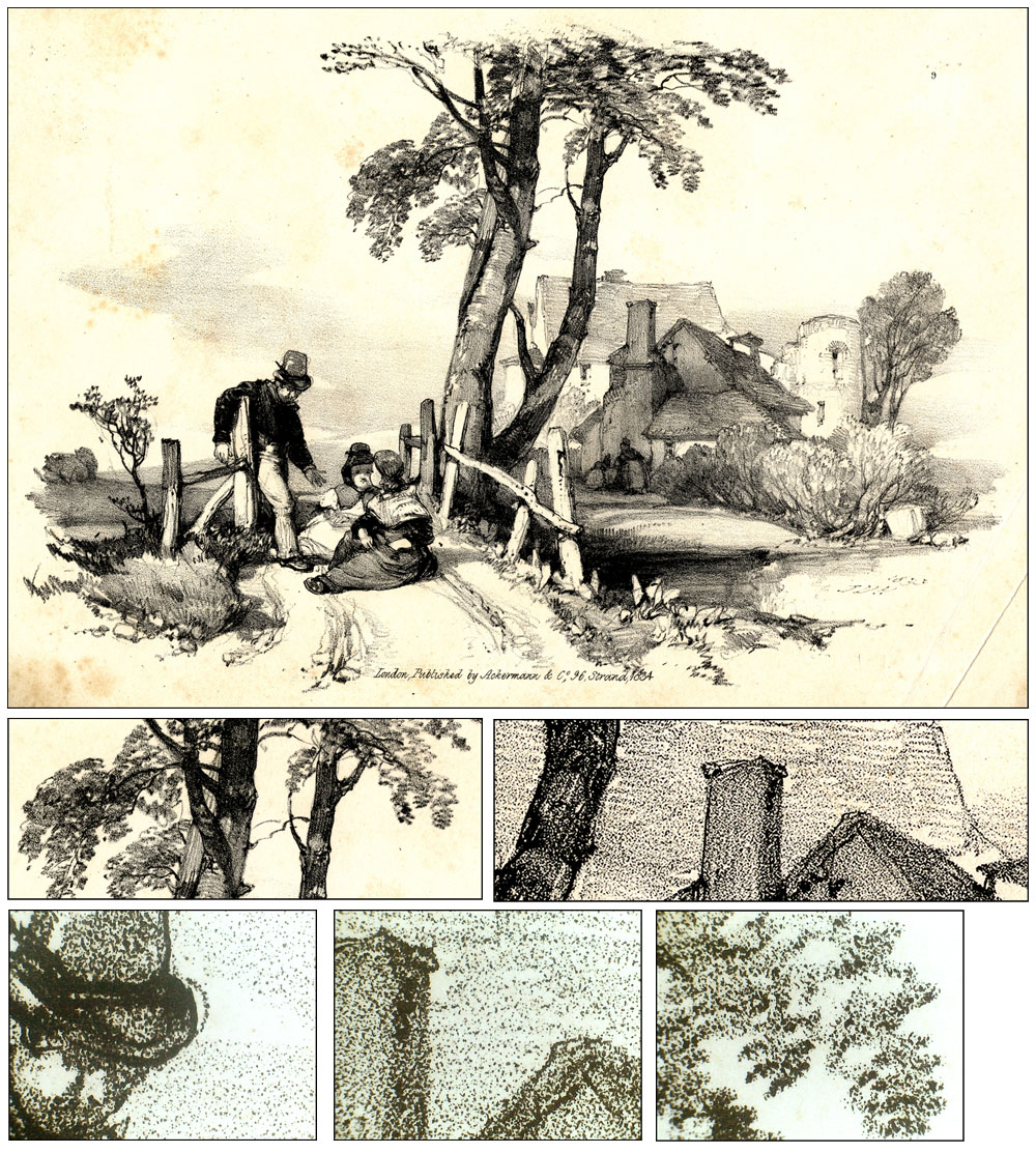 Below is a fairly commonplace lithograph from 1834, bearing the name of its publisher but, typically, not its artist—though the eagle-eyed will spot a semi-legible date and initials in the space at bottom right. This was almost certainly drawn on grained stone. Under the main image I have shown some details at different levels of enlargement. The grained, hand-drawn character of the shading can be clearly seen.
