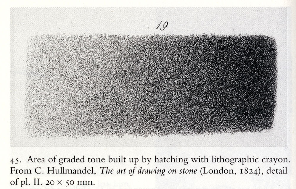 On a rough textured or “grained” stone, a greasy black crayon—called rather misleadingly “chalk”—could be used. This gave a pleasing “natural” effect something like a drawing done with actual chalk, charcoal or soft pencil on a “toothed” paper. This was useful for shading in lithography because it was essentially a pattern of tiny dots—a fairly random distribution of dots of many sizes. Each dot on the stone could be printed from, as a small area of solid colour.