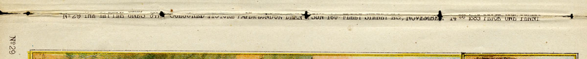 Below I show the strip of text which runs along the spines of both covers. There were no staples or stitching in the weekly paper, I suspect, but there are stitching holes in these copies because they have been removed form a bound volume.