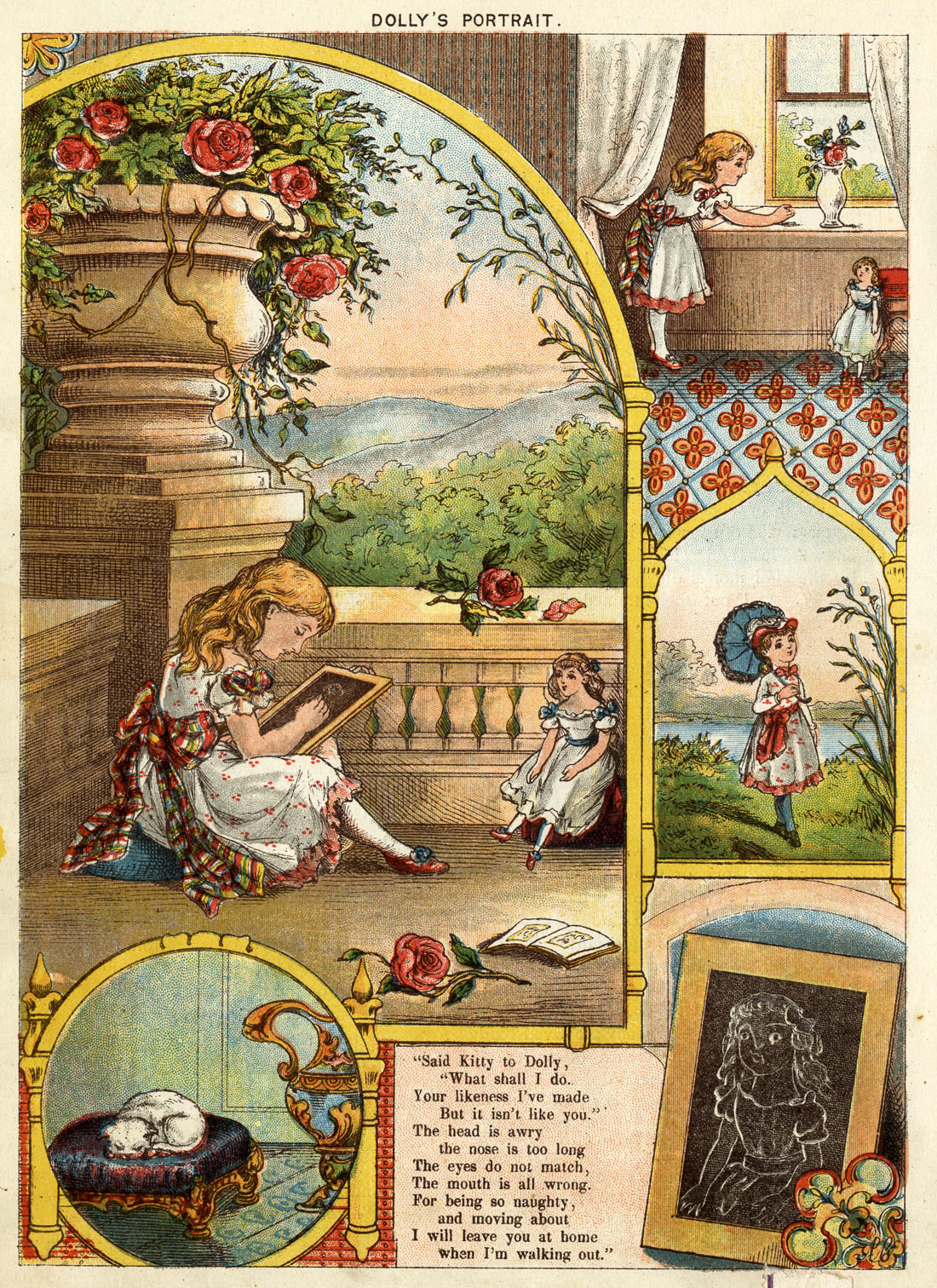 However, there is a narrative sequence of sorts, at least running through the main picture, the one at top right, and the one below that. The girl Kitty is seen sketching her doll on a chalk-board, looking out of the window, then walking outside without her doll.
