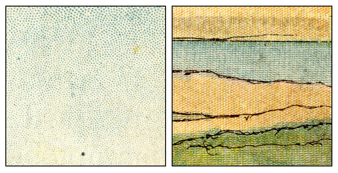 So—was it an early Ben Day pattern which was later abandoned? Was it in fact not a Ben day pattern at all but some other kind of mechanical tint—perhaps a Nelson transfer paper (see Part 5)? I think it is unlikely that they would have mixed the two technologies, but not impossible.