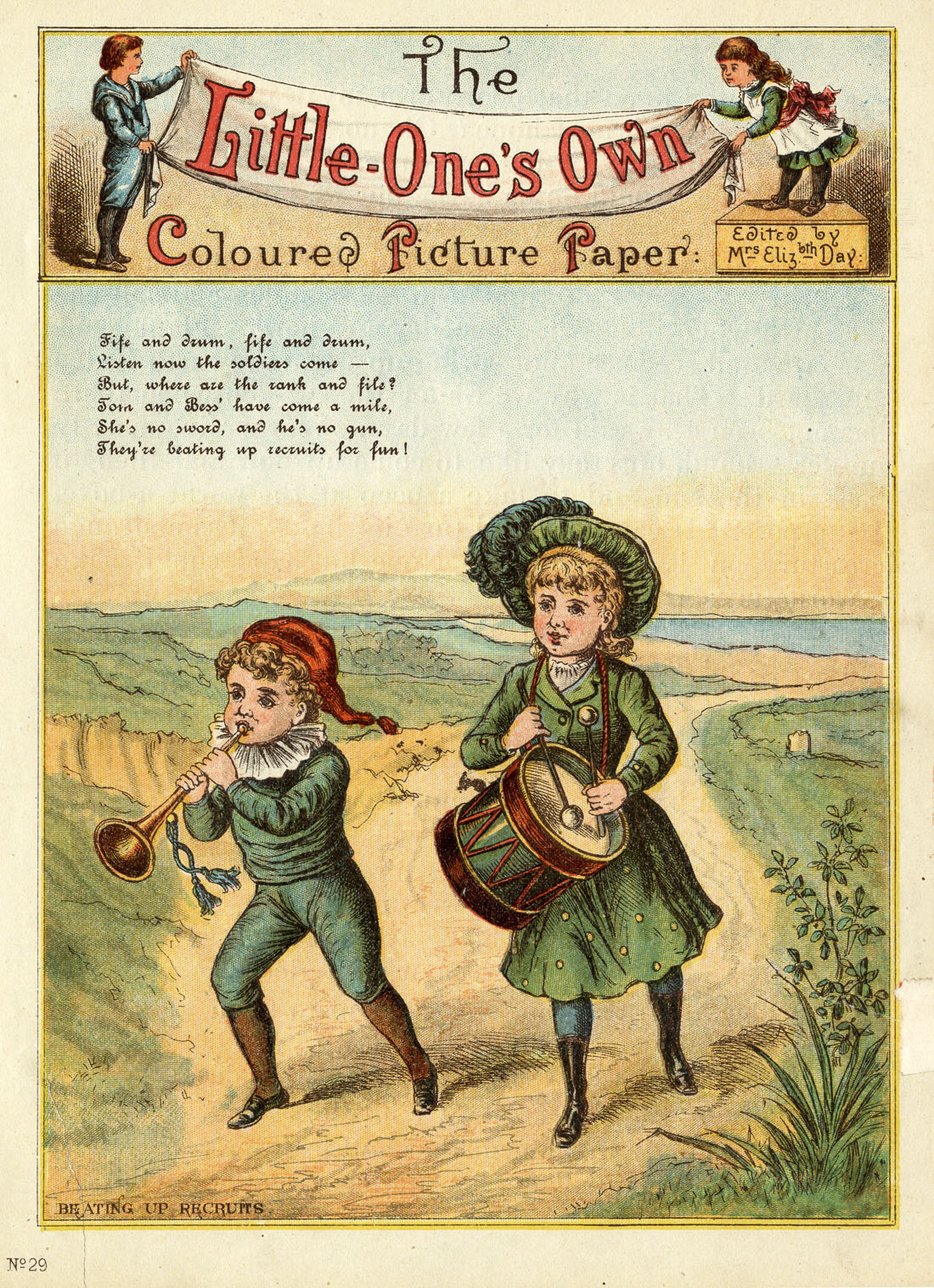 (If you are puzzled by the assertion that Tom and Bess are “beating up recruits,” they are playing at being a recruiting team for one of the armed forces. As such they are drawing attention to themselves by beating the drum and playing the bugle, as also heard in the expression “beating the retreat.”)