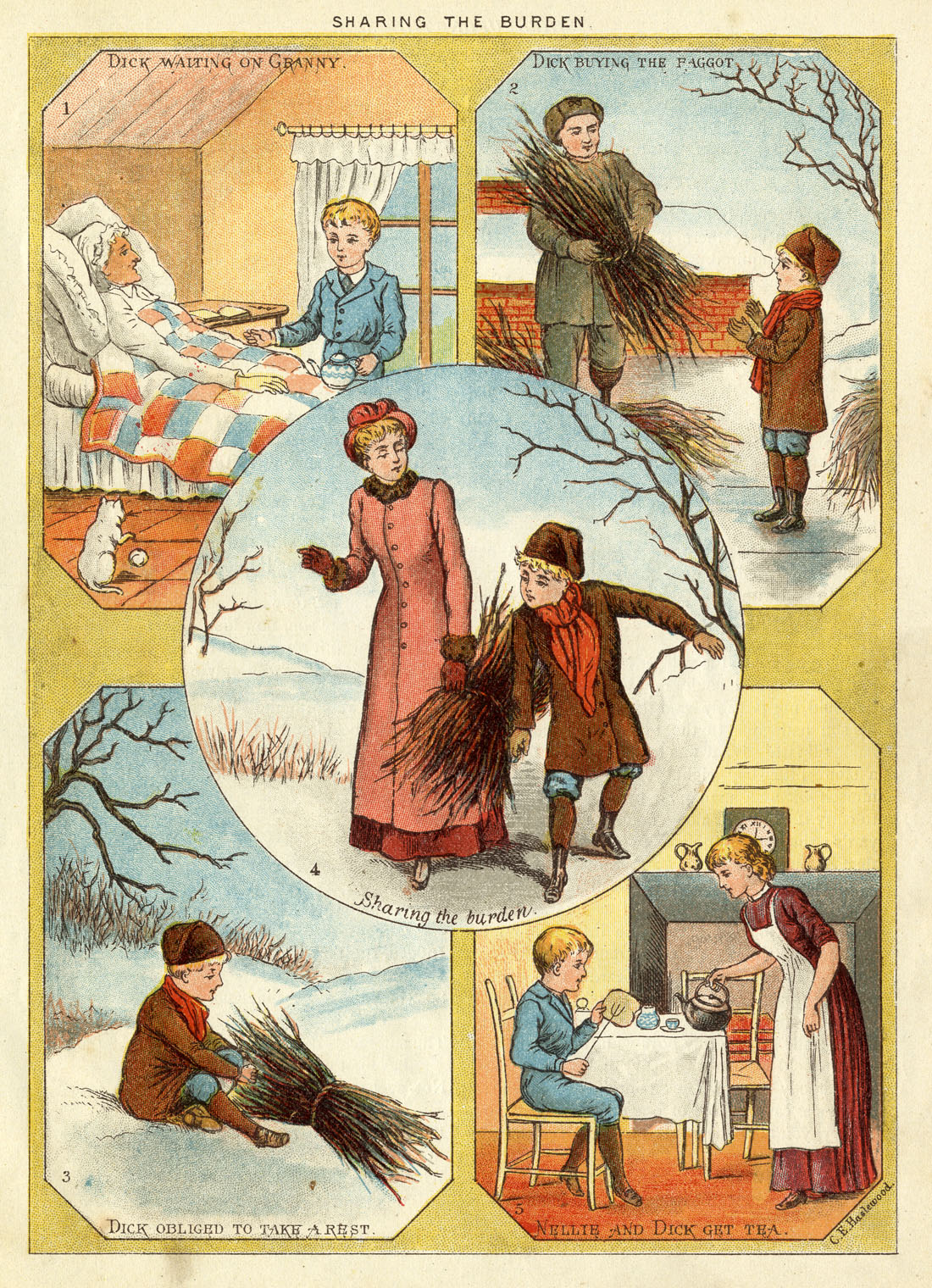 Sharing the Burden is more like an actual graphic narrative. Its action can be followed through the numbered panels, with the sparse captions filling in almost enough information to make it fully comprehensible (especially if you know that a faggot is a bundle of sticks bound together for burning on a domestic fire).