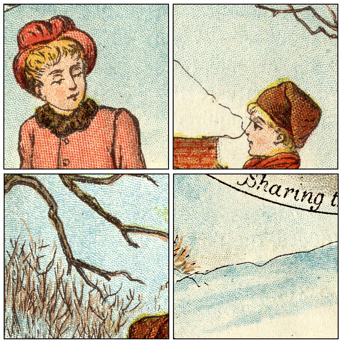 As also seen in Part 5, one of the strong points of the Ben Day system has been brought into play—the Ben Day screen has been applied twice or three times to “multiply” the dot pattern and darken the tint. In addition the screen has been pressed more or less firmly in different places to produce smaller or larger dots. (These were usages which Benjamin Day discussed in his patent documents—see Parts 4 & 5—anticipating what lithographers would do with his screens in practice.)