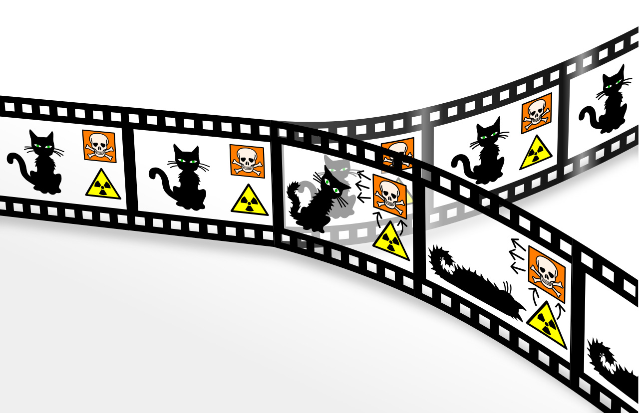 According to the MWI, the cat is alive in one universe and dead in another. In 1952 Schrödinger (sort of) suggested much the same thing, but he didn’t re-use his cat analogy. If he had, his assertion might have made more impact. As it was (in our universe anyway) it seems to have gone no further than the lecture hall at the time. It may just possibly have influenced Everett’s own thinking, though. I’m grateful to John Gribbin, whose In Search of the Multiverse includes this little-known twist in the cat’s tale; also to Wikipedia for the illustration below, using Schrödinger’s cat to illustrate the MWI.