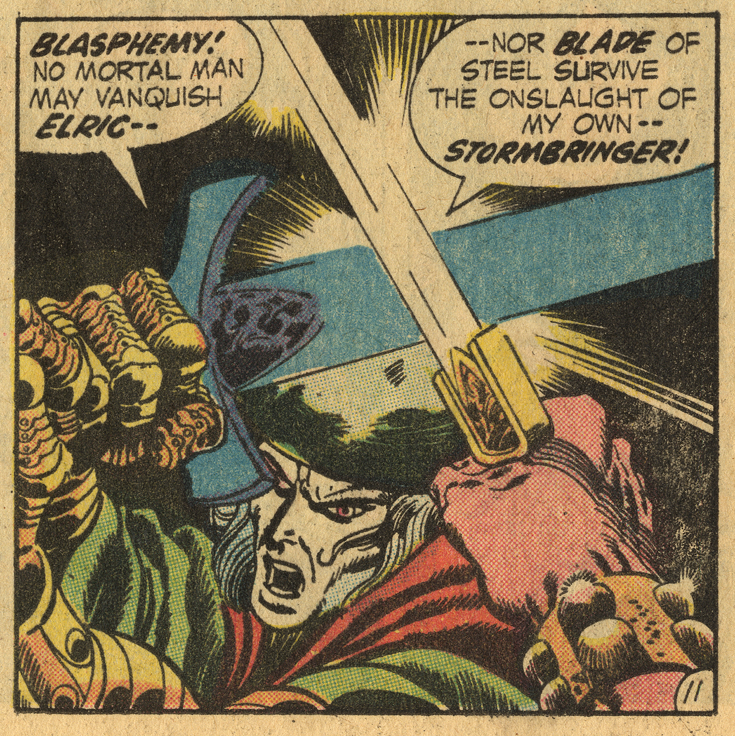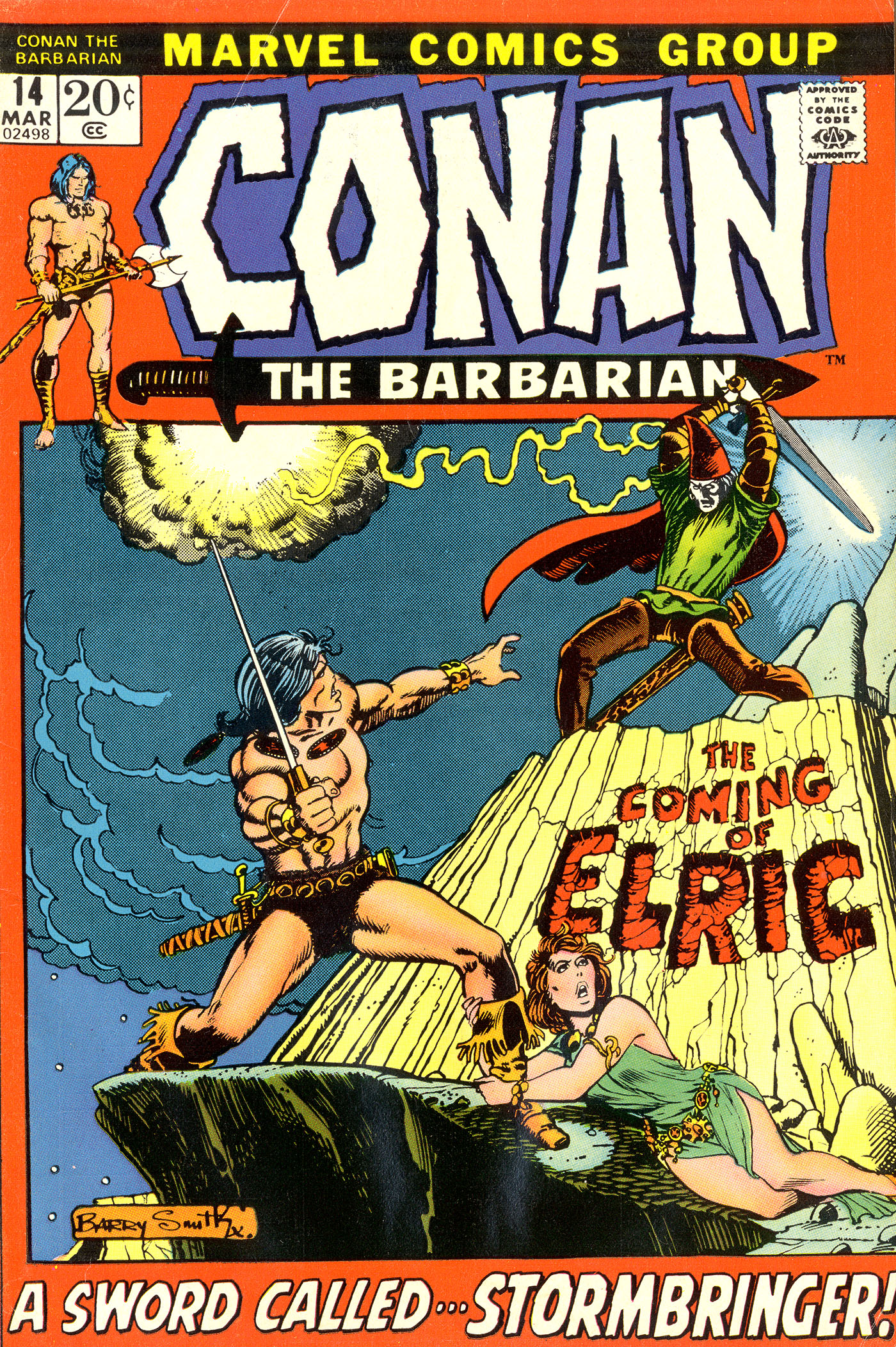 Barry Smith (later Windsor-Smith) drew the two-parter. He, being a Brit and a smart cookie, might have got wind of some danger in the air, since he drew Elric in the outlandish gear seen on US paperback covers by Jack Gaughan (vide supra).