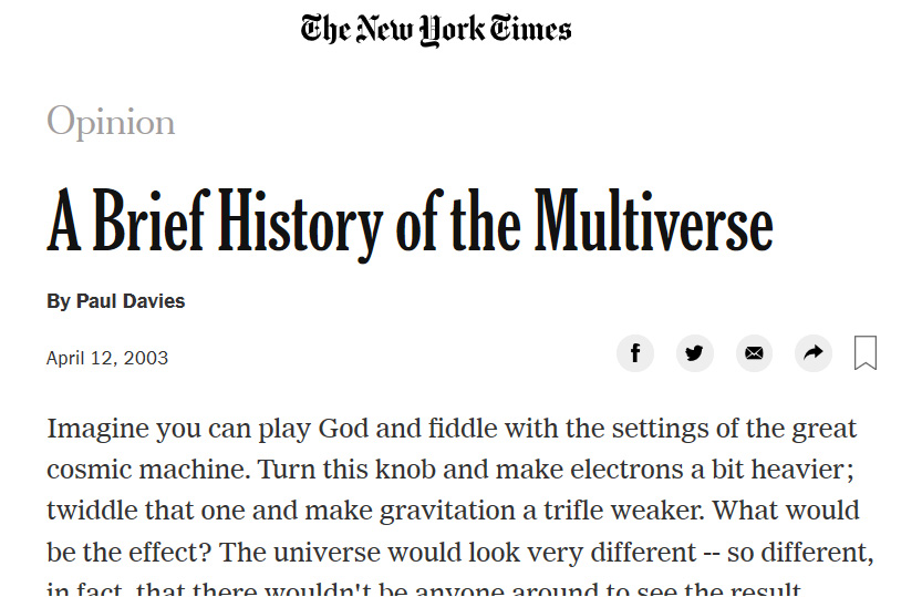 Davies, BTW, was possibly the first to use the Hawking-derived title ‘A Brief History of the Multiverse’ for that article—or perhaps it was an inspired NYT sub-editor—but he certainly hasn’t been the last. I thought I’d been very clever and invented the title when I first planned this post. I soon found out differently. Not entirely dissimilar to Michael Moorcock’s use of the word multiverse itself, perhaps? As above, so below…