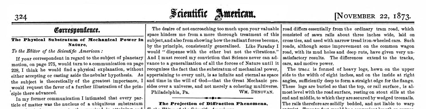 On the correspondence page of Scientific American magazine, Nov 22, 1873, a letter appeared from William Denovan, scientist and author of popular science books. At some length, he argued that a previous correspondent had got it wrong about planetary motion. Denovan’s science is very convoluted and very 19th century and need not concern us here; anyway, it’s not the science of multiple worlds that he’s discussing. What’s interesting is how he signs off: