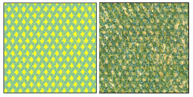 Here are two enlarged quarter-inch or 6mm squares—vegetation from Panel 1 of the Tarzan page shown above. On the left, some red (magenta) dots are shown at something like “standard” size, perhaps a little larger. On the right you can see quite marked variation in size, where the technique of pressing harder on the Ben Day screen has been used very skilfully.