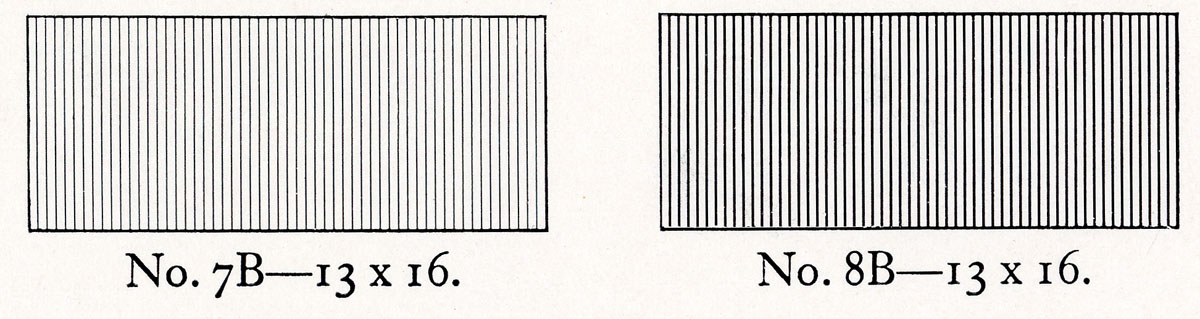 If a simple grey tint were needed, they would ask for a certain Ben Day tint—say, number 523 from the catalogue. The Ben Day craftspeople in the engraving department were expected to supply the tint in a fairly standard version. (“Nine-&-a-quarter” etc. below refer to the size of the screen, in inches.) (click to enlarge etc.)