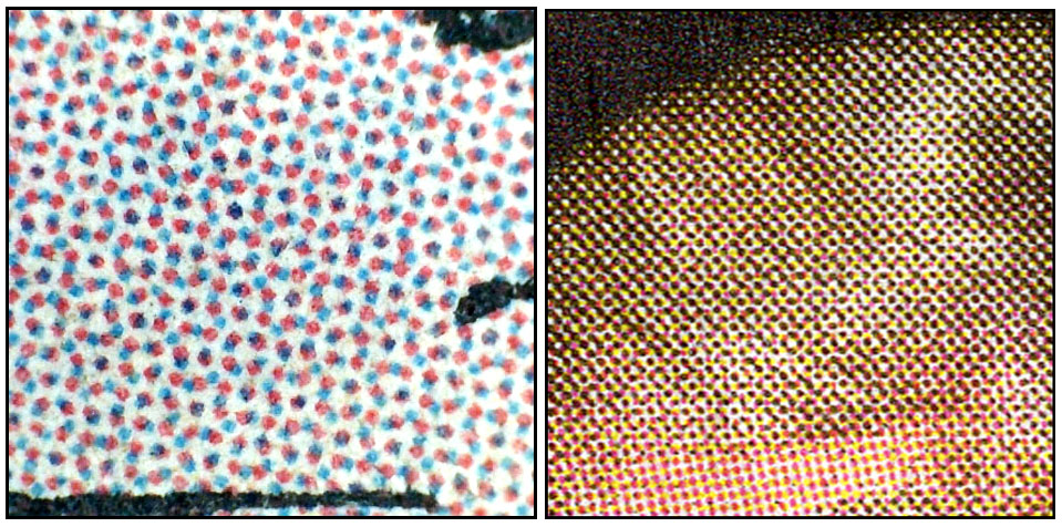In practice, if (when!) the registration slipped—i.e. the colour printing plates were not perfectly aligned with each other—the exact overlap of the dot patterns would of course vary.