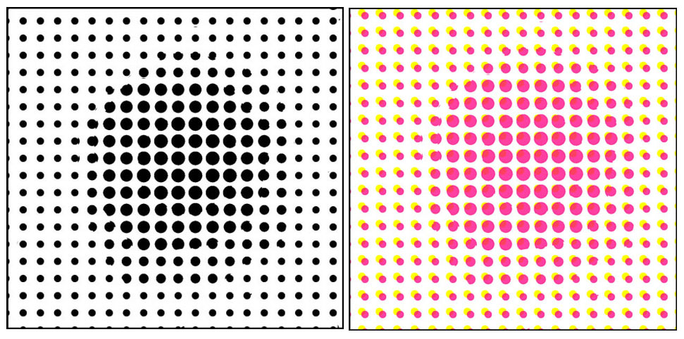 A major issue, if the screen angles are not optimized, is the famous Moiré effect—as seen below in black & white. This will happen with coloured dots printed over each other as well, of course: