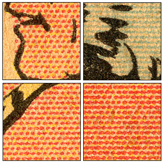 In the bottom right corner of this square there is a pale green area, created with a “standard”-looking Ben Day dot pattern in blue, over a “solid” yellow. The tint is something like Ben Day no. 523 or 527, as shown above, though probably smaller dots.