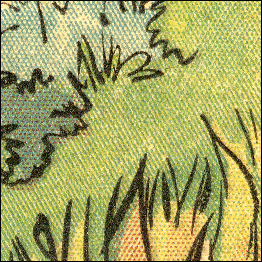 Below I have blown up a one-inch (2.5 cm) square, in which blue dots are used for both pale blue and green areas. For the green, the blue dots have been printed over an area of “solid” yellow ink—that is, 100% or continuous yellow colour. Very little of the blue itself is a simple or “standard” Ben Day pattern—as it were “straight out of the box.” The Ben Day men have been up to their tricks—creating what I will call “special effects.”