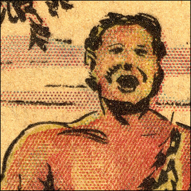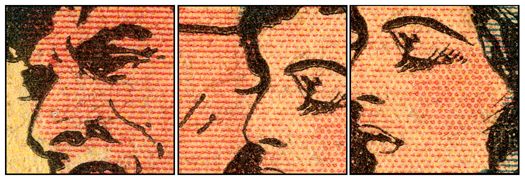 The top of the hat has some darker dots which might have been created by deliberate manipulation of the Ben Day screen, or might simply be due to the vagaries of cheap letterpress printing. In future posts I will be showing more of the accidental variation in dot size which often occurred, especially in the comic books.