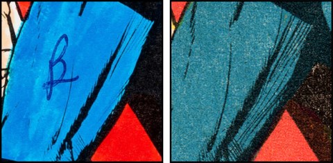 Let’s look at some of the colours in Thor 163, and how they were designated in the YRB system. Here is solid cyan, or blue, labelled B on the colour guide (left), and as printed on the page (right):