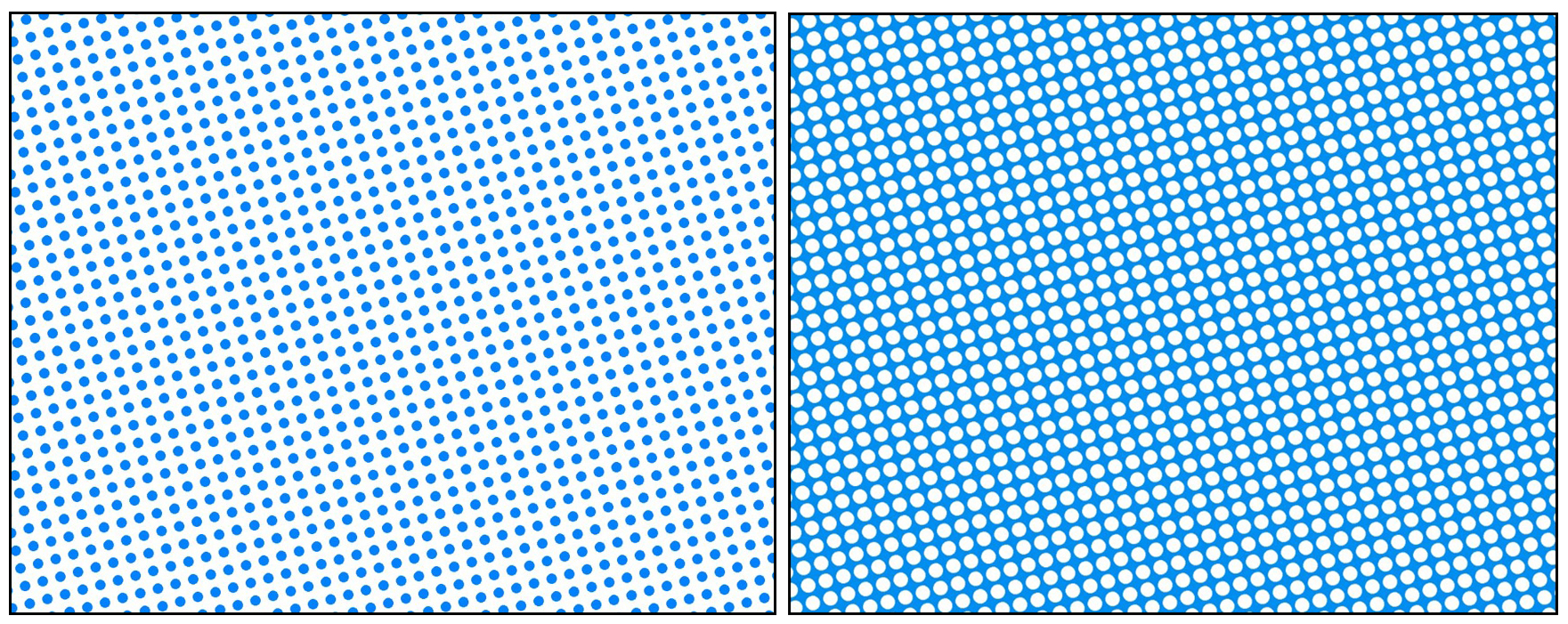 Tints made of both positive and negative dots, when printed in real life on paper with liquid ink, are prone to becoming darker than intended due to dot gain, as defined here (a web page about offset litho printing, not the old school comics variety, but a clear and relevant account of dot gain). On newsprint dot gain is particularly likely, largely due to ink spreading between the coarse fibres of the paper.