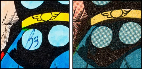 The screen angles in old-school comics varied, but until the mid-1970s the colours were always kept 30 degrees apart from one another. This avoided Moiré patterns and ensured stable ‘rosette’ patterns when tints were printed over each other, keeping the colours uniform or ‘flat’, and consistent.