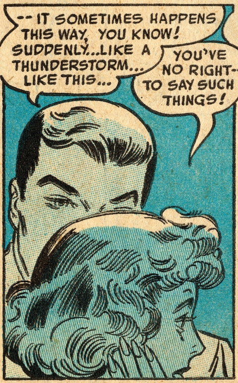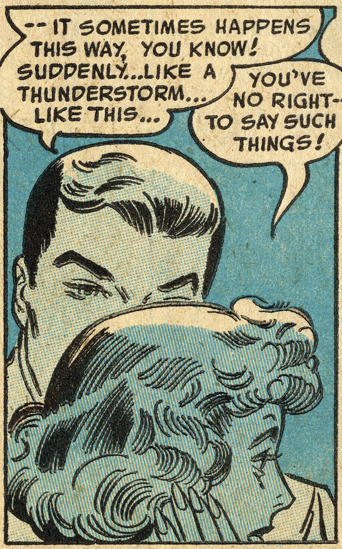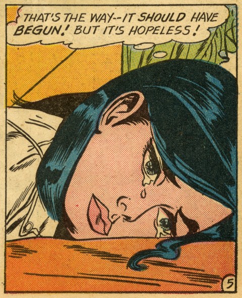 As before, I worked through a notional example of colour separation using just one picture — an out-of-copyright comic book panel from Dream Book of Romance 5, drawn by Frank Bolle and taken from the original B&W art. I downloaded it from Lars Teglbjaerg‘s page at Comic Art Fans and use it with his kind permission.