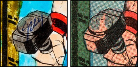 [Readers have let me know that other copies do have the same defect — many thanks! And Nicholas Burns spotted the small white space between Thor’s hand and his cape, seen on both colour guide and printed page (and in my ‘B’ square above). This should have been sky blue, i.e. B3 in this case. Nicholas reckons the separator was ultimately responsible for both these errors in B3, and I think he’s right — though the colourist must share the blame!]