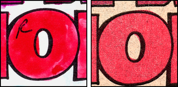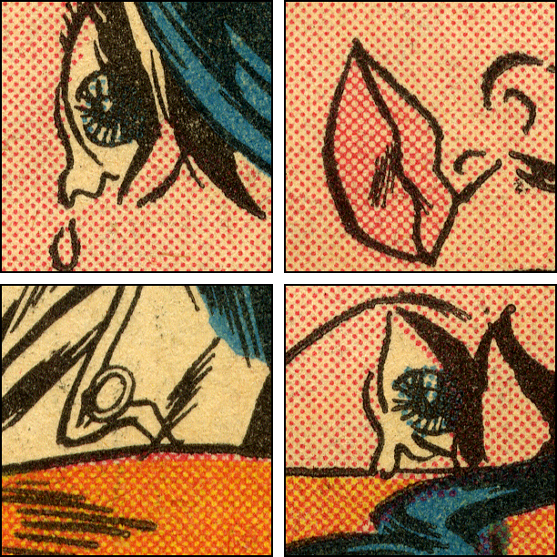 The 1962 DC comic panel at the head of this page (magnified details shown below) was the source for Roy Lichtenstein’s painting ‘Hopeless’, and shows that era’s new variety of (so-called) ‘Ben Day dot’.
