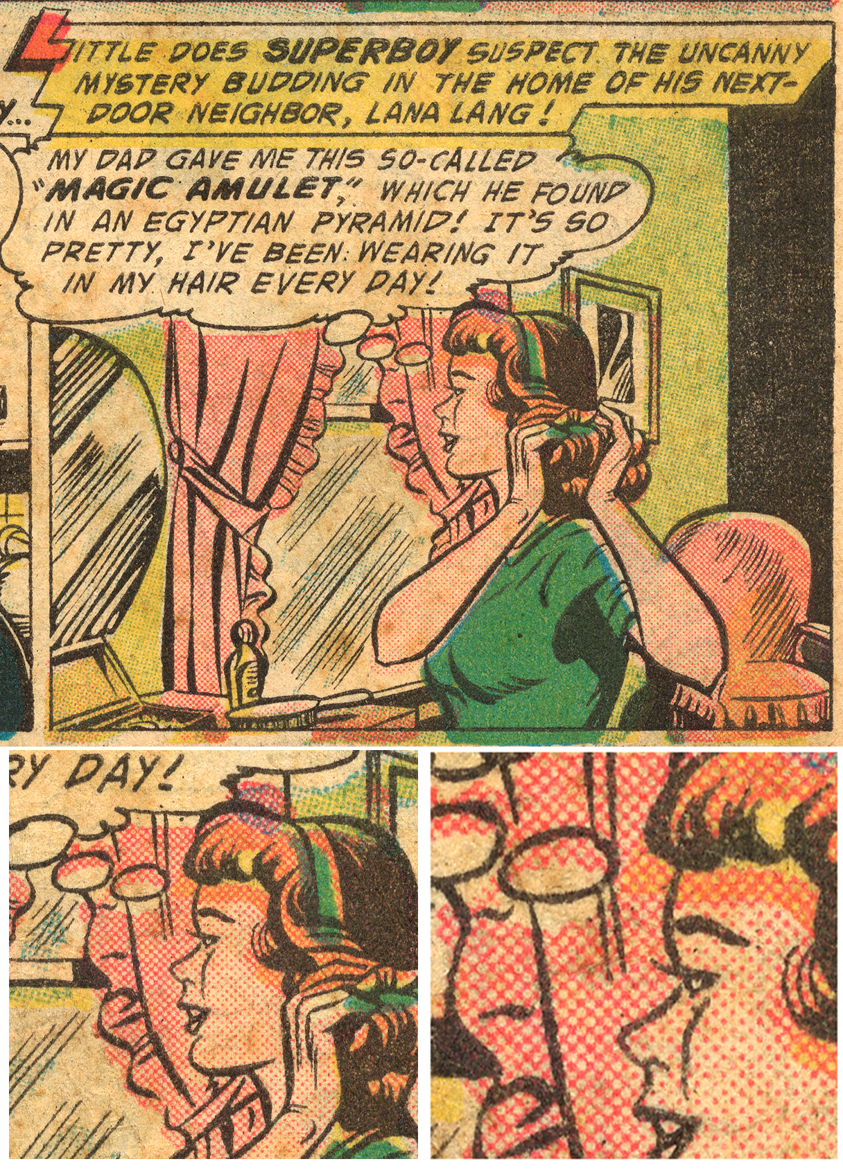 An example of the new Silver Age DC tints is shown below, in a panel scanned from the first page of Superboy 52 — like Showcase 4, cover-dated October 1956. Lana Lang’s skin is the same tint as the old ‘25%’ Craftint dots. Her hair and the curtain behind her both show a ‘50%’ magenta (red) tint, which previously would have been made up of lines. The magnified details show that this tint was now formed by a dot pattern very close to a checkerboard in appearance, at least when printed on white paper.