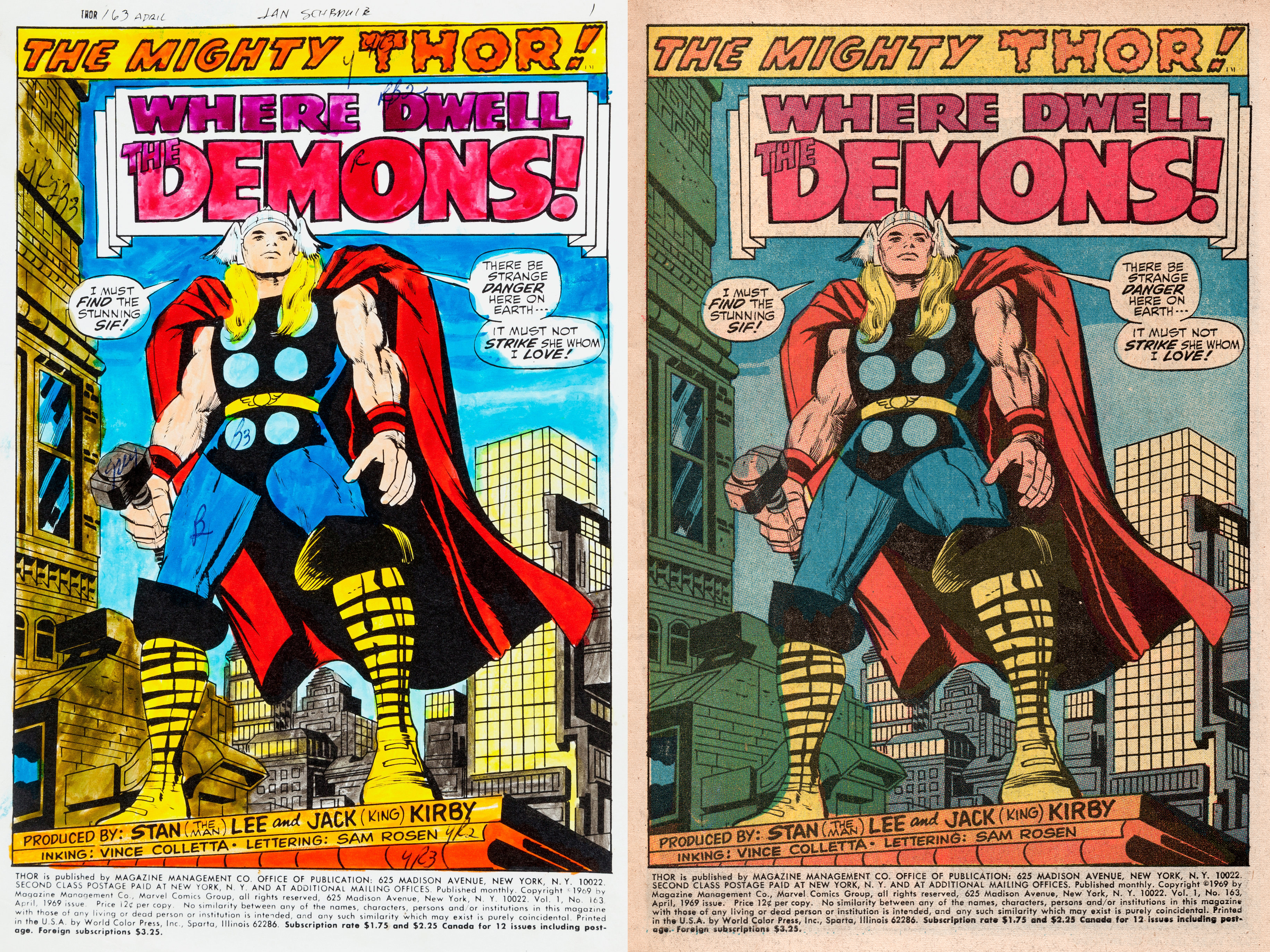 The complex mix of tints on Thor’s hammer seems to have been labelled only ‘gray’ or ‘grey’. In my copy of the comic, an error occurred which makes it easier to see that this grey tint was Y2R2B3 — the same as the standard caucasian flesh tint with added 50% blue. Let all Midgard decree that it shall henceforth be known as Mjölnir Grey!