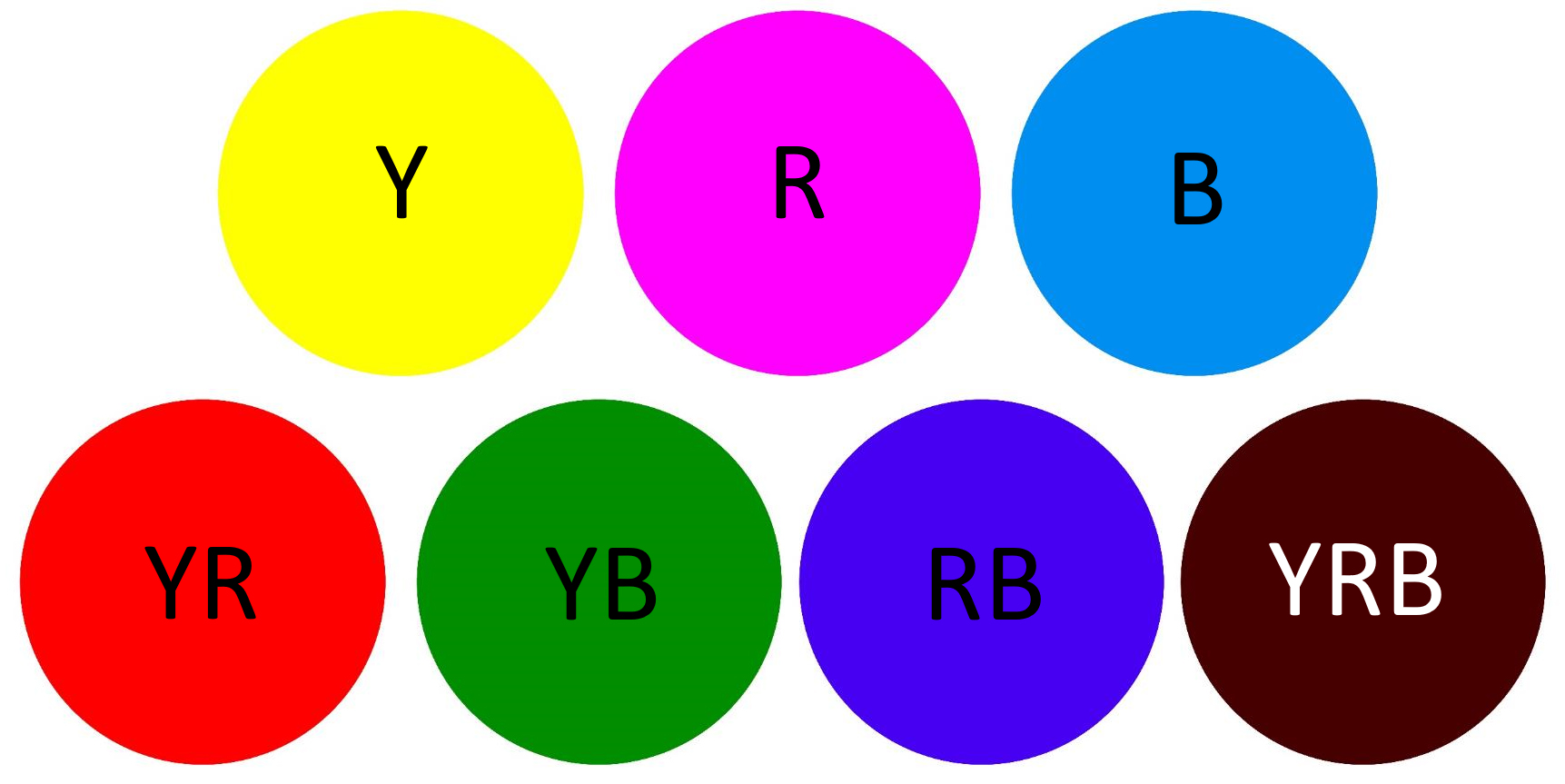 The primary colours outside of the printing biz, of course, were usually thought of as red, yellow and blue, often abbreviated to RYB. However YRB became the preferred option in comics, probably because their yellow was always printed first, magenta second and cyan third — or Y, then R, then B — and finally black on top of the other three. (In other areas of printing, different / more flexible orders of printing might be used.) When checking progressive proofs of printed covers, production staff and editors would also have seen images in Y-R-B order (and finally K on top).