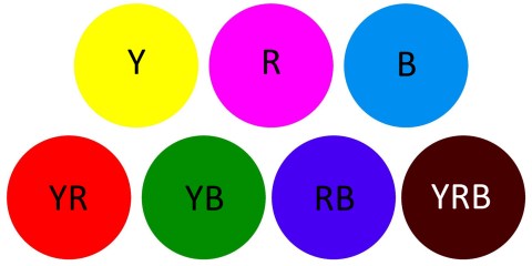 Below are my approximations of the three primary colours in the YRB system, and the colours which resulted when their semi-transparent inks were printed over one another on the page. This kind of colour mixing is known as physical blending.