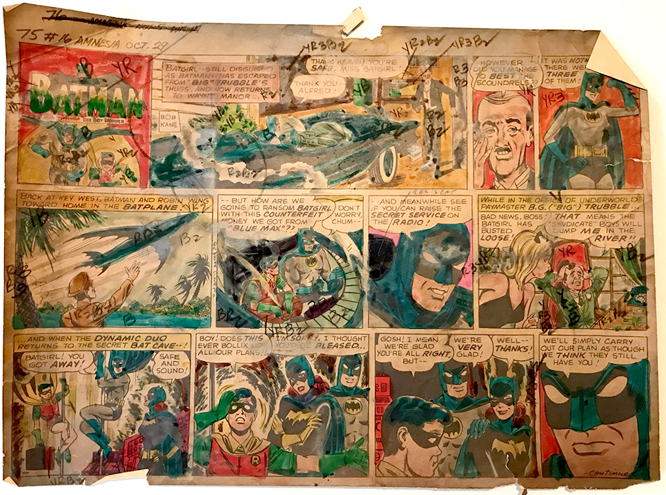 The same system can occasionally be seen in use in the newspaper strip field in the 1960s. Whether it spread there from the comic books is unknown. Dewey Cassell has a page at Comic Art Fans where you can see YRB in action on both a colour guide and a proof page (printed on better paper than the final newsprint version) of a 1967 Batman strip, as shown below. The condition of the colour guide is an indication of how little they were valued at the time (not by Dewey, I hasten to add!) — they were usually thrown away, meaning that few survive at all.