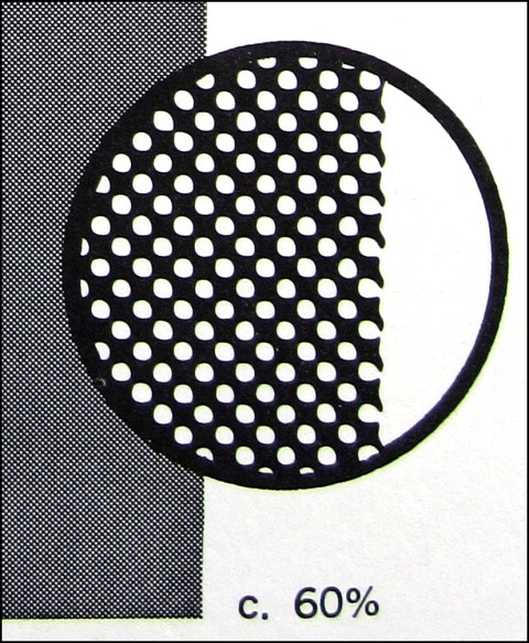 And again we see negative dots, not a checkerboard. In my experience looking at 1960s Marvel and DC comics, the darker tint is more likely to show the negative dots appearance. Here is an illustration of a 60% tint from the 1965 book Preparing art for printing by Stone and Eckstein (Van Nostrand Reinhold, New York) p.44. (It doesn’t mean ‘c.60%’ as in ‘approximately 60%’; in this illustration, picture ‘a.’ showed a 10% tint, picture ‘b.’ was 30%, and picture ‘c.’ followed)