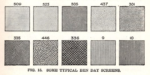 These were the genuine Ben Day dots, laid down by hand onto the metal printing plate, using a sheet of gelatine (the Ben Day screen) which had been moulded with the dot pattern. The gelatine sheet, backed with celluloid for strength, was supported in a wooden frame. You can see why it got the name “screen”.