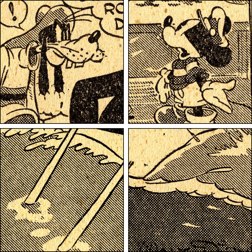 As seen in previous posts, comic strip art of the early 1930s—like many other types of illustration printed by letterpress, black & white or coloured—started with a B&W drawing, done by hand on drawing board. Both dotted black tints—for grey shading in B&W—and the dots used to make pale and mixed colours, were added later—at the stage when printing plates were made.