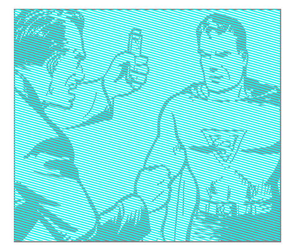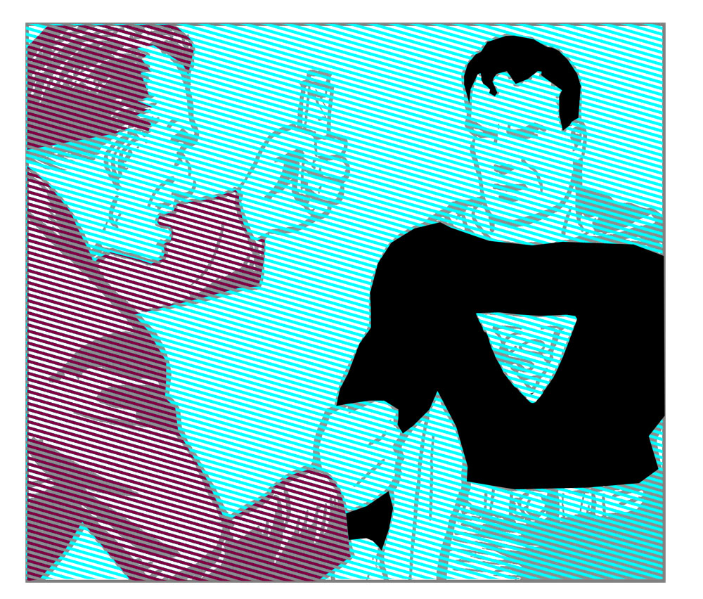 You will note that I haven’t used the same screen angle as I did for my magenta experiment. This is deliberate, of course. It matches the angle of the blue lines in Captain America 1—by the 1952 definition, 15 degrees; as per the 2009 angles, 165. This is not the angle of the blue Craftint lines we have seen in most other comics.
