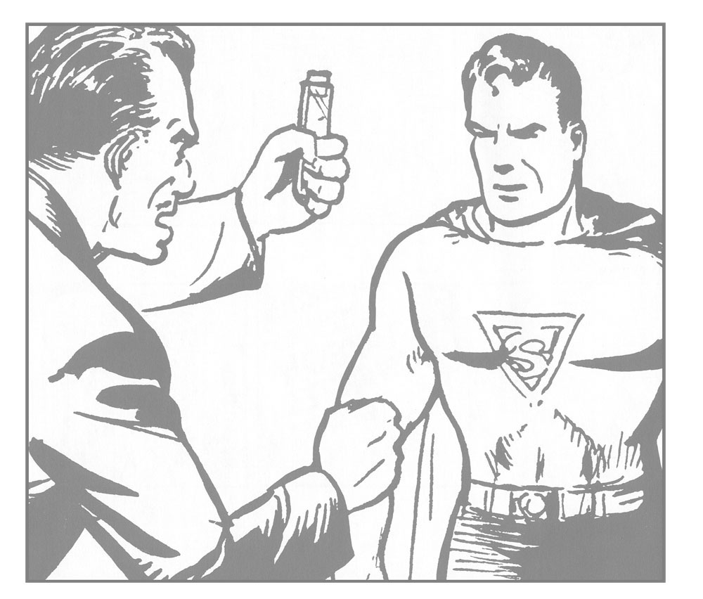 Now, I know which bits of Superman need to be solid, 100% blue. His hair, for a start. Various bits of his costume. I note that Joe Shuster hasn’t drawn a line where the end of his sleeve should be. (He’ll probably blame his inker.) I’ll have to make a careful mental note of where I end the blue sleeve.